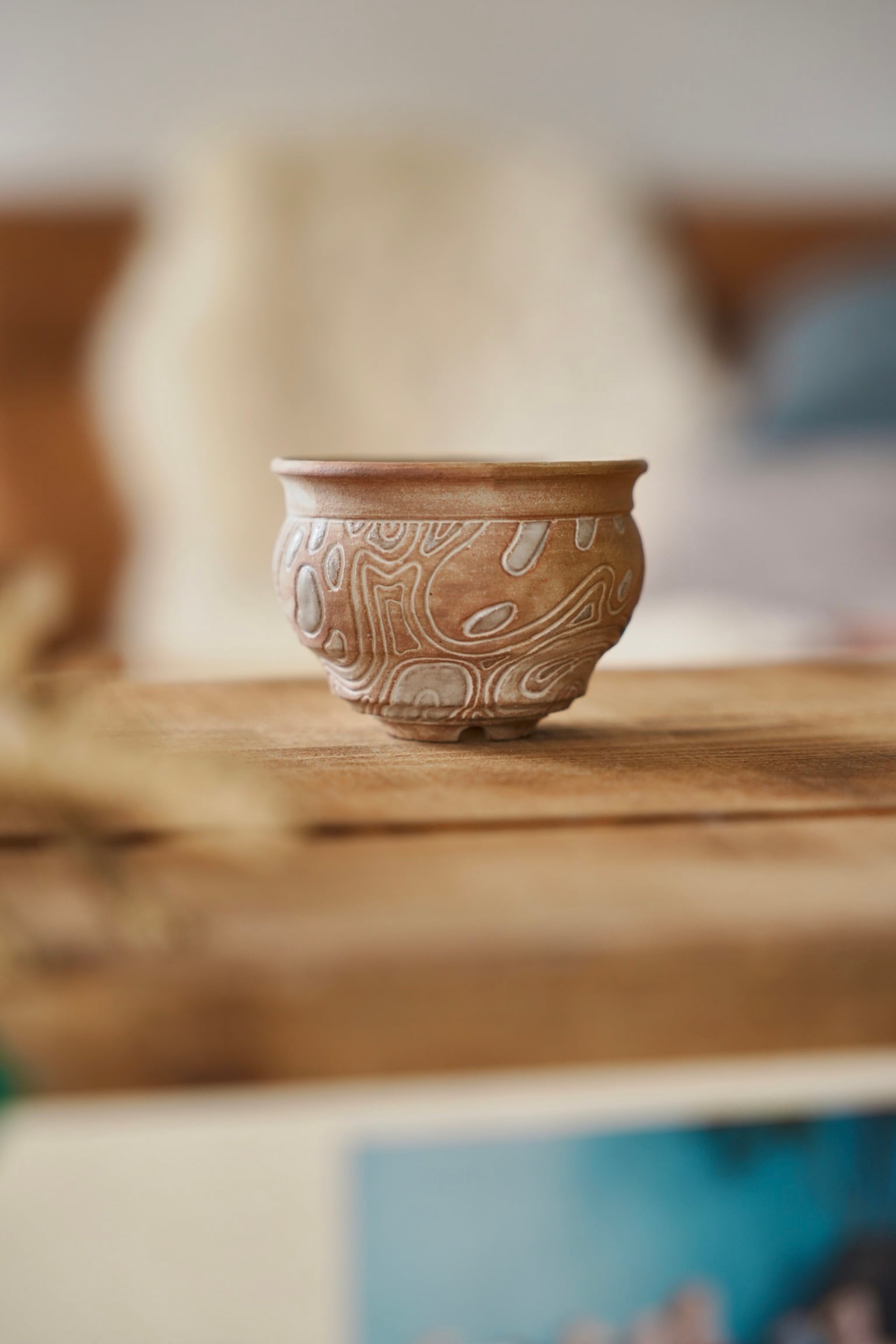 猫と植物の相似性を抽象的な線の流れで表現した植木鉢。